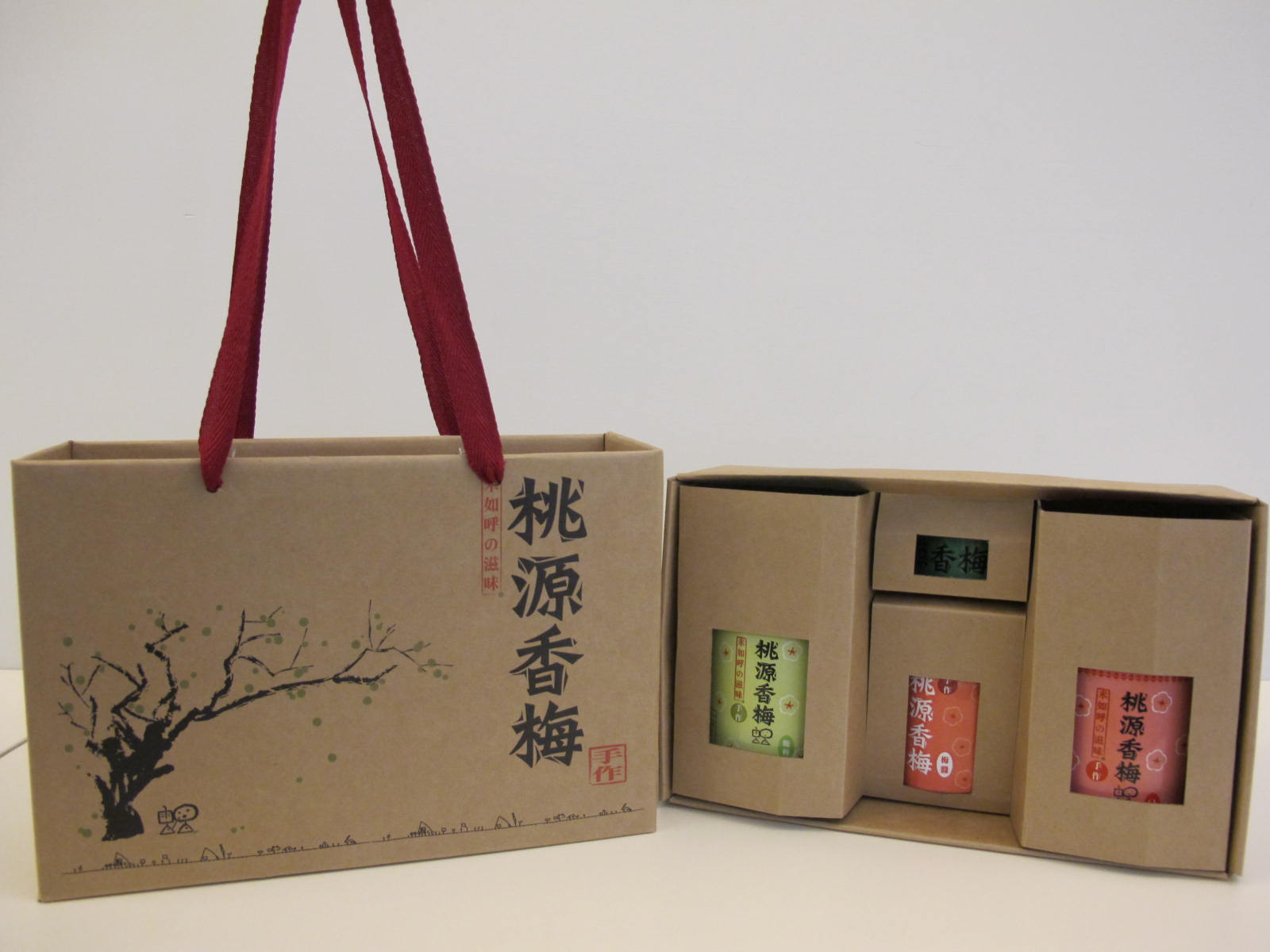 | 友好禮盒(大) | 樸實手感的禮盒,內含梅精、脆梅、Q梅、梅醬各一瓶,健康好伴手,送禮首選。友好禮盒為再生紙製作,黃豆油墨印刷 | 1350元/一套 |