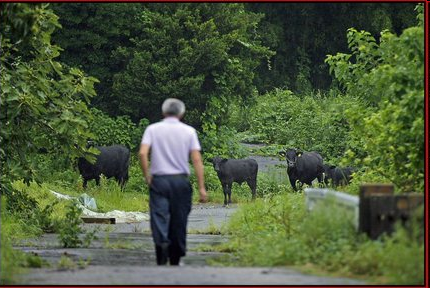 有的小牛能吃草,卻因為長大了,被頸上的繩索勒傷。松村還找到一籠金絲雀,遲了一步,籠裡二十隻鳥兒都餓死了。一年來,松村獨自活在沒有電的鎮裡,太陽一出來,他就起趕緊去照顧還活著的大約四百頭牛、六十隻豬、三十隻雞、十隻狗、超過一百頭貓。他拍下二十多段短片放上網,只見整個地區寂靜如鬼域:房子後園全是雜物一片淩亂,卻是貓咪樂園,松村倒出貓糧,十多隻貓咪湧上來!房子街角走出來的,是幾頭牛閒閒遊蕩;市中心的大馬路,突然跑出兩隻駝鳥。「近看大得可怕呢。」他在短片加上附註。