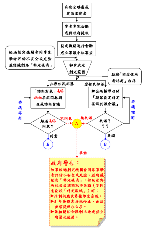 您的疑問也是我的疑問,而我已經把我的疑問寫在《圖解【劃定特定區域】》,也許政府認為劃定「特定區域」是唯一選項,且是一項可以貫徹執行的政策,因而不用去提「無法與原住居者諮商取得共識,即原住居者不同意劃定特定區域」時,要如何處置。