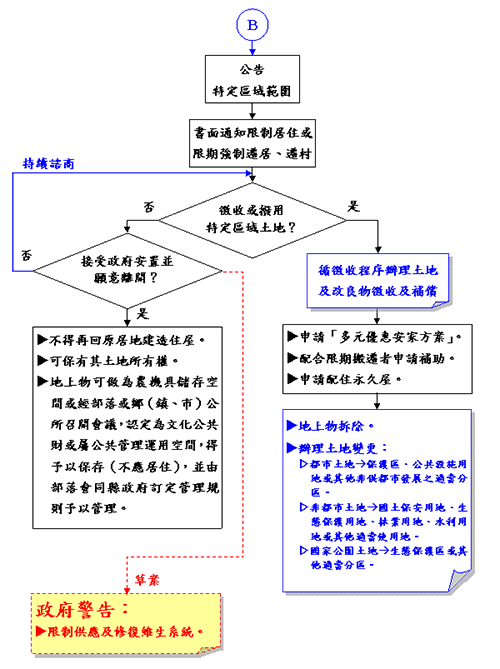 為方便災區及關心災區的朋友了解劃定「特定區域」種種,本文「圖解」勾勒政府想法,看看在「尊重」的言詞以外,對於不同意或沒共識的「特定區域」準備那些作為,以及經劃定為「特定區域」者,政府將採取那些措施。
