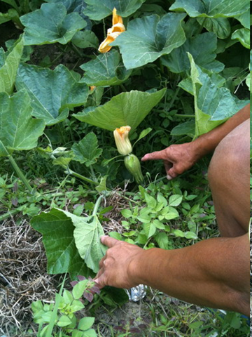在南瓜田裡,黃金寶帶領一行人翻找那顆南瓜寶寶,他透露:「南瓜會開出雌花與雄花,透過蜜蜂授粉,才能媒合出南瓜;每天早上,我都得巡田,有時得用人工沾沾雄花粉給雌花,幫它們授粉。」而針對南瓜蟲害問題,他也採取用費洛蒙性氣味吸引以減少之;此外,哈肯鋪希望黃金寶等人就算初期至少要做到用藥在吉園圃認證標準的安全範圍,若是農夫沒有足夠經費接受認證,該鋪也可以協助做相關認證,以進一步確保消費者能吃到安心的食材。