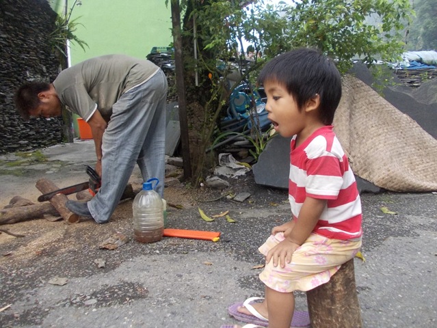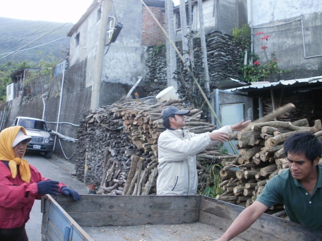 吾東他們幫VUVU載木材,正在把木材卸下,整齊堆疊在VUVU家裡.