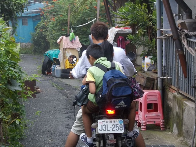 爸爸載著小朋友要去隔壁村的德文國小上課