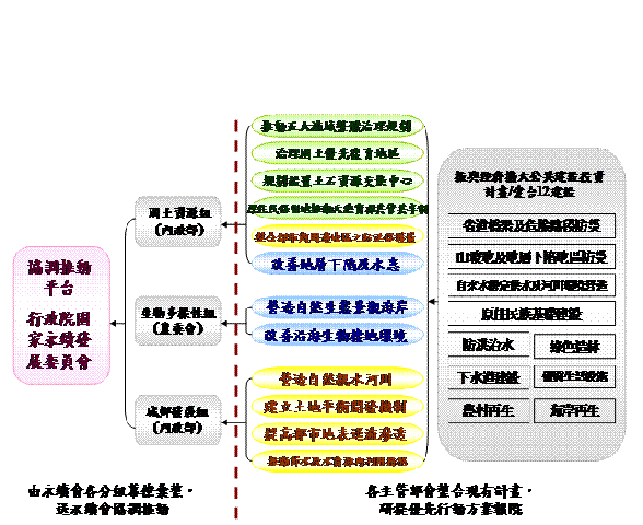 「為確實達到流域整體治理目標,整合水資源利用、水質保護、治山、防洪、海岸防護與國土復育等相關工作,未來建議宜將現有河川管理、水庫管理、防洪治水等機關整併納入整合性流域管理機構,配合組織改造環境資源部下設流域管理機關。」(原文P.40)