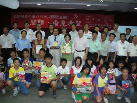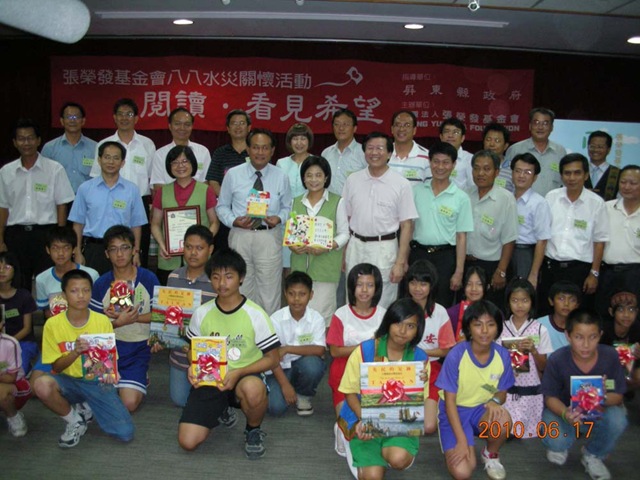 17日,張榮發基金會在屏東縣政府舉辦了一場「閱讀‧看見希望」書籍捐贈活動,共捐贈屏東縣15所國小3500冊圖書,不少偏遠國小受惠,除此之外,張榮發基金會還捐贈八八災區內的佳冬國小戶外體能器材、圖書矮櫃,及林邊鄉竹林國小校園修繕工程。
