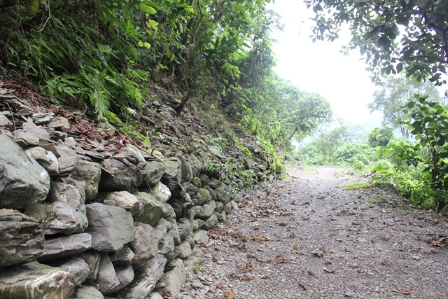 雖是救災道路,但整理得很仔細,沿著山壁砌出石牆,靠近邊坡的地方就以大一點的石頭立起「交通錐」當成安全措施。Vuvu Cama按著走山路的習慣,削藤作杖,一路指點著:「你看,這個石頭(交通錐)很漂亮,村長說要維持原貌,沒有給它塗顏色……這個(石牆)是八八零工做的……水泥是我們請鄉公所幫我們鋪水泥路面,經費只有一點點,所以最後只鋪了一點點。但是也很好,有多少就做多少。」