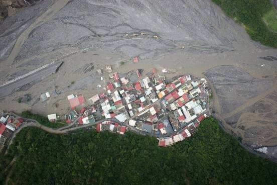 空拍來義東部落。明顯看到東部落被洪水吞噬及「最後防線」被摧毀(圖/成功大學防災研究中心)