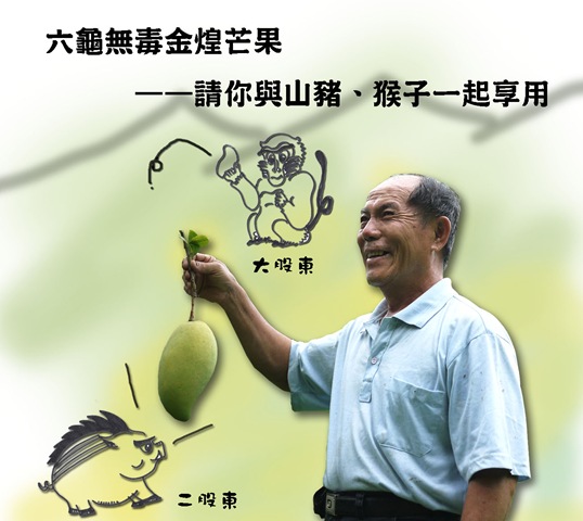謝伯伯用災後重建的誠心來種作,無奈這兩萬斤芒果,卻因為皮裳(外表)的些許缺陷,無法進入正常通路。希望你能支持,與山豬、猴子一起享用六龜無毒金煌芒果!