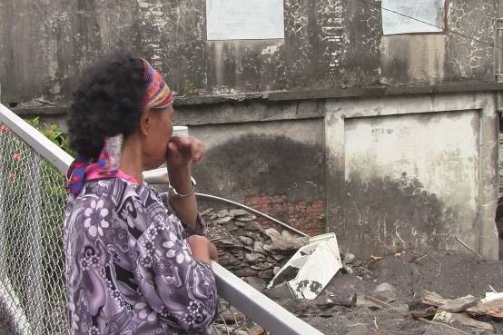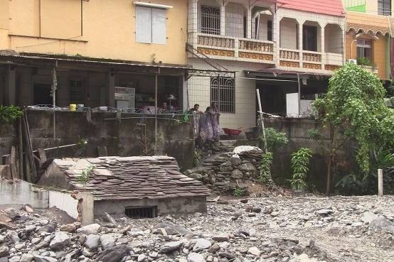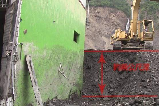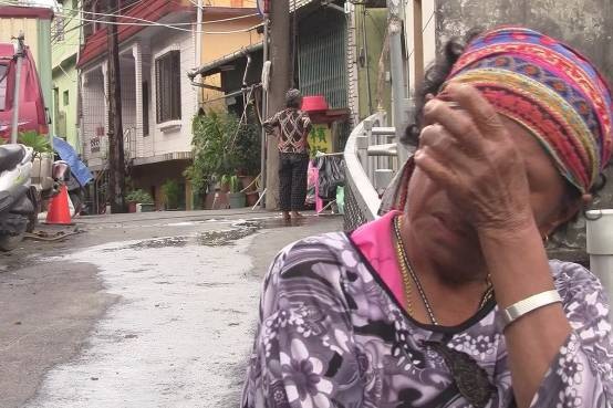 簡紅姑看著被土石掩埋滅頂的家屋,不禁傷心的留下淚來。