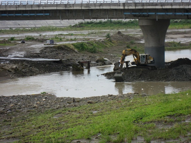 經過上次八八風災的洗禮,第七河川局在旗山橋頭設置了一處水閘門,一早就看到兩台怪水正在清理水閘門與旗山溪匯流處淤泥,擴大排水渠道面積,據民眾所說,這次大雨高雄客運南站地區還是有淹水的情況,在低窪處大約20cm左右深度,並沒有太大的災情。