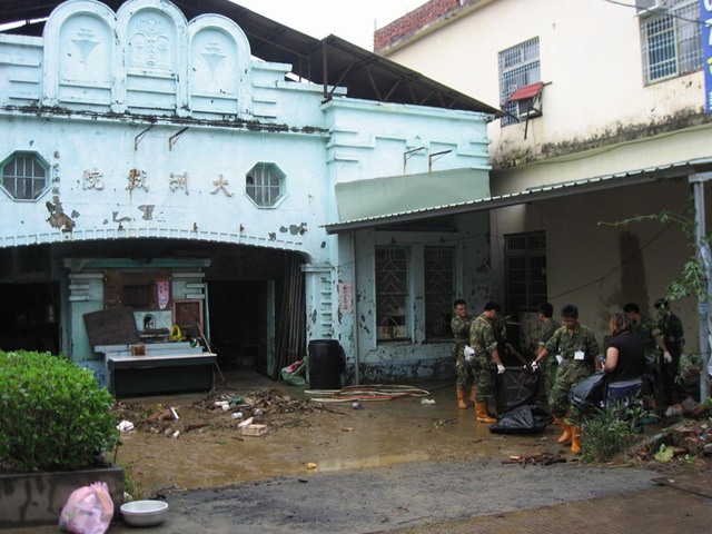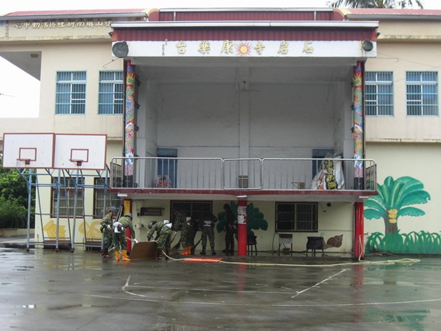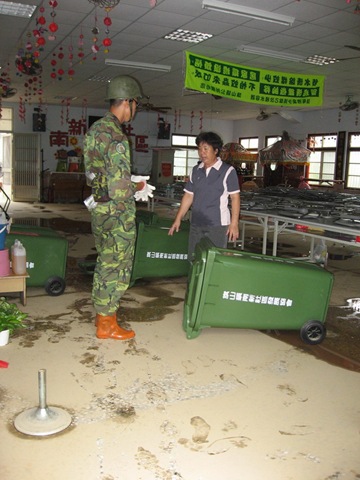 南新社區的狀況也是差不多,到達活動中心時,也有一群國軍弟兄協助清理,還有一台軍用卡車停在廟前廣場,這邊的淹水高度大約有30cm,活動中心的地板都是黃土,要清理需要一番工夫。