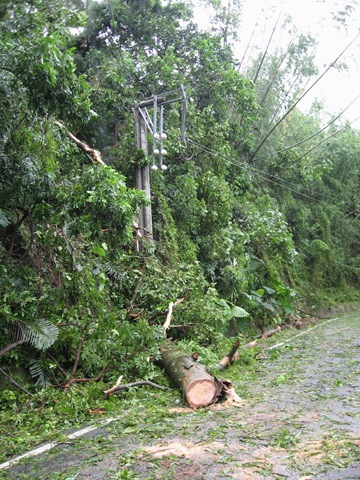 之後轉往中寮社區,從溪州國小旁一路進去,發現高40線受創不輕,路面上佈滿了樹葉和伏倒木,沿路還有好幾處的小坍方,車輛進出並不方便,路邊有潺潺溪流,可見山上的含水量之豐沛。沿著道路往上,還未到達崑山宮,就發現電力設備被傾倒的樹木壓毀,也證實宜紋所說山上目前停電的狀況,後來有看到台電電力工程車上山勘查,希望能盡速搶救。
