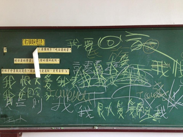 在民族國小廢棄的教室裡,孩子們在黑板上寫下「我要回家」、「我恨大愛」等字眼,黑板上半脫落的教學靜思語,不完整的句子是「要讓孩子吃必要的苦。」