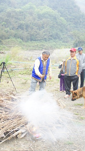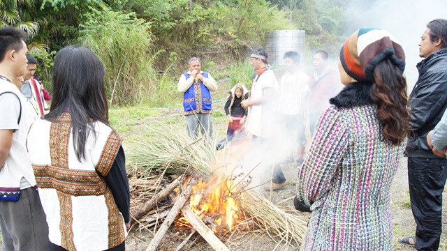 由重建會長向祖靈與上天說明今天的活動,這次燒狼煙,部落族人說定全程都只能用母語溝通