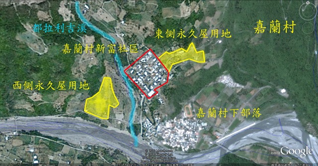 東西側永久屋用地範圍,西側包含五年前海棠颱風的受災戶(等了五年才等到…),共蓋60戶房屋,而東側預計約蓋60戶房屋。(圖源:Google Earth)