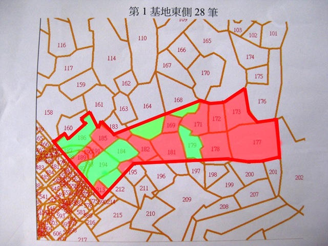 東側永久屋用地範圍,綠色為拒簽徵收同意書之地主的地,紅色為已簽同意書之地主的地。(圖源:台東縣金峰鄉鄉公所與嘉蘭報告小火車)