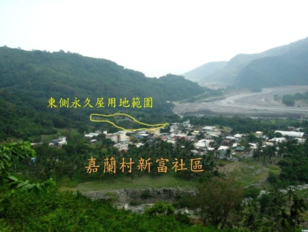 再說,東側地主不願釋放土地,主要原因是這塊佔地2.2公頃的土地是嘉蘭僅存安全的土地,除了現在的災民外地主的子孫也要有立錐之地。如果安全的地被政府徵收,再加上不斷流失的「下部落」土地,嘉蘭人到底還剩多少土地呢?