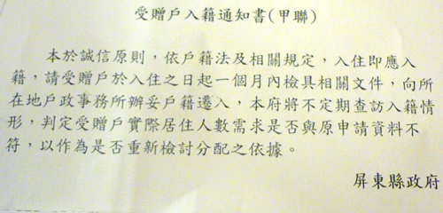 在受贈戶入籍通知書(甲聯)中則提到,「本於誠信原則,依戶籍法及相關規定,入住即應入籍,請受贈戶於入住之日起一個月內檢具相關文件,向所在地戶政事務所辦妥戶籍遷入,本府將不定期查訪入籍情形,判定受贈戶實際居住人數需求是否與原申請資料不符,以作為是否重新檢討分配之依據。」