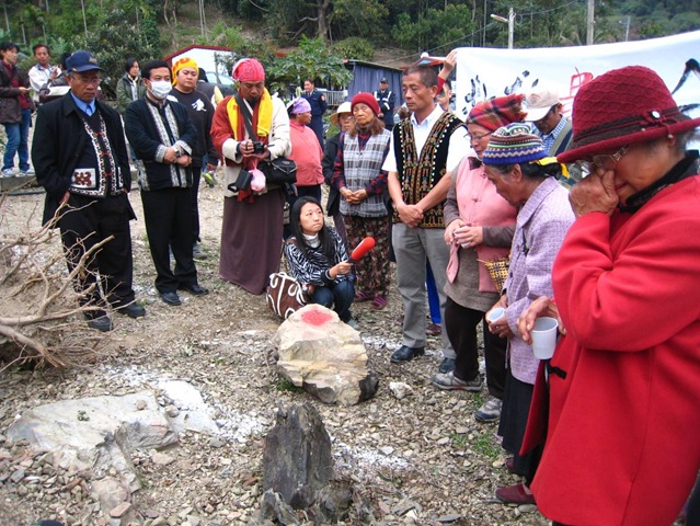 3月8日嘉蘭村民在被破壞、位移的cakar祭石前以傳統儀式祭告祖先遺址被破壞,並請其原諒,許多vuvu哽咽落淚(陳曉琦 攝)