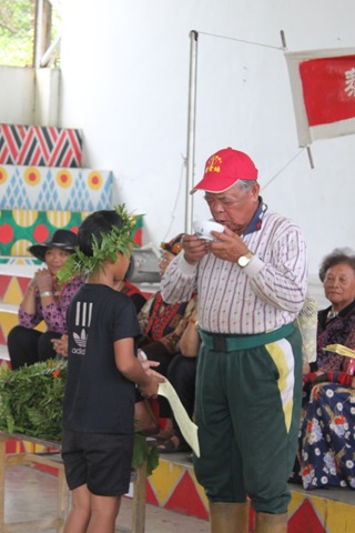 部落的老人替小朋友戴上頭飾,小朋友回敬以自己釀製的小米酒。