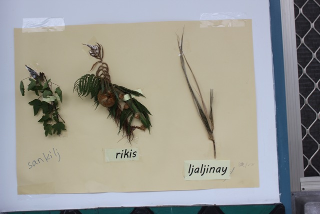 辨識植物也都用母語。現場也有小朋友製作的木雕、器具、童玩、琉璃珠飾品等,成果豐碩。有的是孩子帶回家,有的未來會陳列在學校。