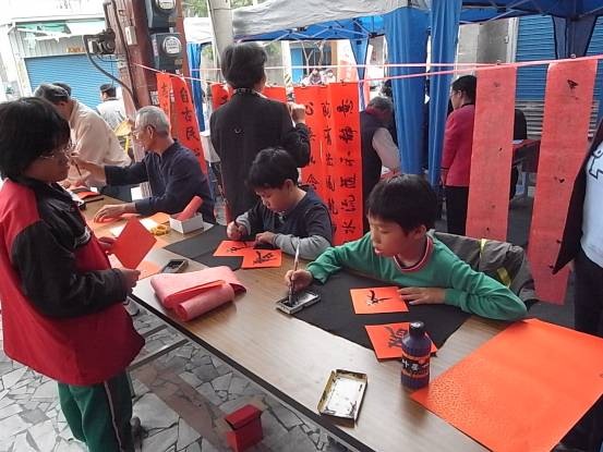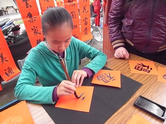 另外,還有四位小小書法家,現場揮毫著「春」「福」分送給民眾。四位小小書法家分別來自林邊鄉及佳冬鄉的弱勢家庭學童,透過家扶中心於災區學校的才藝認養,聘請吳允中老師指導學童學習書法,才習道半年,四童就能像大人般的有模有樣。