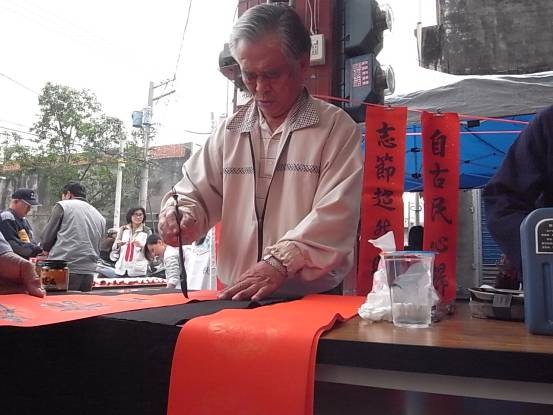 現場揮毫的志工中,有位鄉公所的員工,凡是鄉公所的喜帳輓聯及考取大學的紅榜,皆出自他的手。