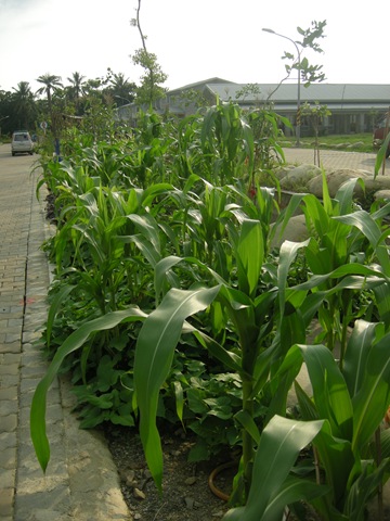 (下)有的居民在原本路邊種植草皮的地方種上了玉米,如同過去在山上部落生活時,在自家附近找到空地就種上蔬菜一樣。居民們也不知道在園區內這是否可行,不過現在還未接獲關切。
