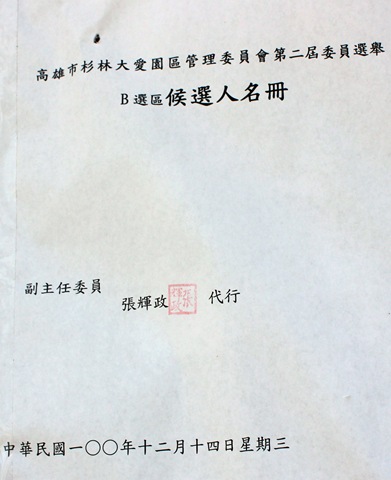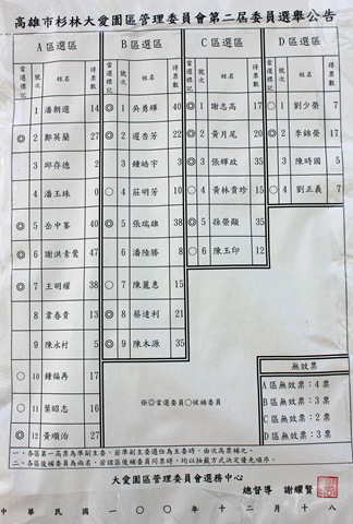 高雄市政府委託旗美重建會執行「大愛管理委員會選務中心」,將開票結果公開在各區公布欄上。