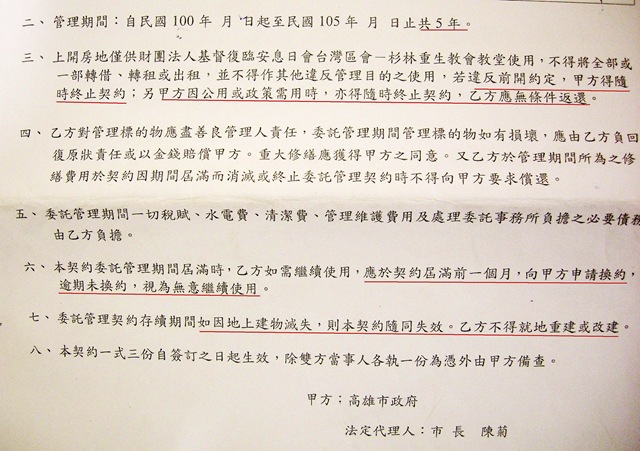 這些疑慮包括,簽約使用權僅有五年,變數頗大,「我們覺得五年太短,至少要二十年,而且應該自動續約。」條文也載明,市府可因「公共或政策需用」,隨時終止契約,教會應無條件返還等。(契約書內容見文末)
