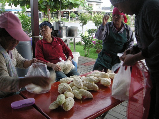 阿瑞的麵店也是工人、村民相聚的場所。婦女將自家山上種的苦瓜,拿下來和分送給大家。