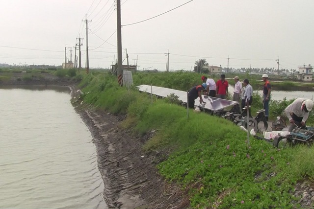 這天,劉天福的漁塭旁,聚集了許多人,廠商忙著組裝的工程,趕著等一下的「下水典禮」,屏東縣長曹啟鴻也趕到現場關心進度,還有兩組紀錄片工作者全程紀錄,大家都期待著,這歷史性的一刻。