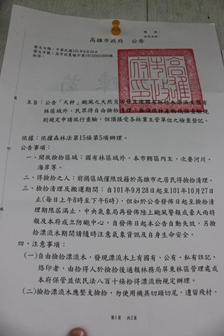 所以,公文中註明高雄市轄區內主、次要河川、海岸等,自101年9月28日起至101年10月27日止,每日上午八點到下午六點,只要設籍在高雄市的居民,都可以撿漂流到國有林之外的漂流木,但是不能夠拿上頭有註記或烙印為國有、公有或私有的木頭,並且若需動用大型機具運載,需要徵得管理單位許可。