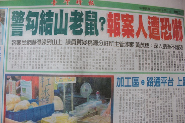 桃源分駐所開始接不完的報案電話;甚且,10月6日(周六)拉芙蘭分駐所接獲章姓男子報案,指有幫派份子在其私人地上挾眾暴力取財,毆打被害人耳膜受損。