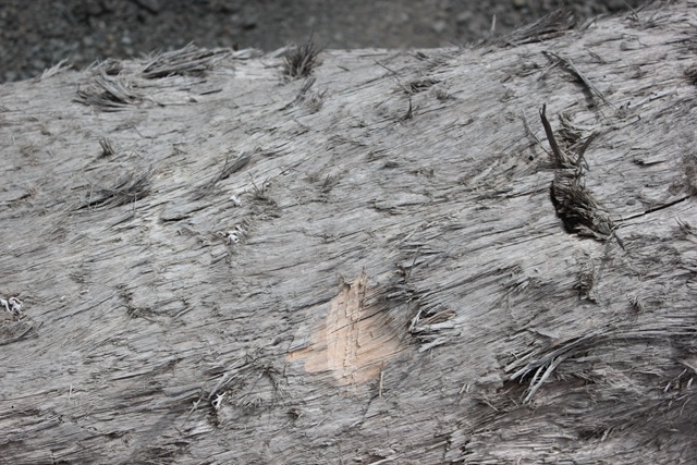 被土石流翻滾後傷痕累累的漂流木表面,砍一刀刻痕,目的是辨認其木材種類