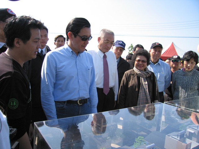 小林重建會會長蔡松諭向馬英九、吳敦義與陳菊解說預定建造的新屋模型