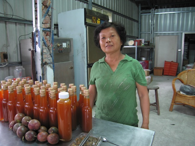 「你來看看,這些都我自己種的。」阿甘姨的手工作坊裡擺設了一罐罐的濃縮百香果汁,底下便是自行收成的百香果,次級加工品與天然農產之間沒有任何距離。「這些都是職訓局的老師教我,我去學的,沒有加農藥喔!」