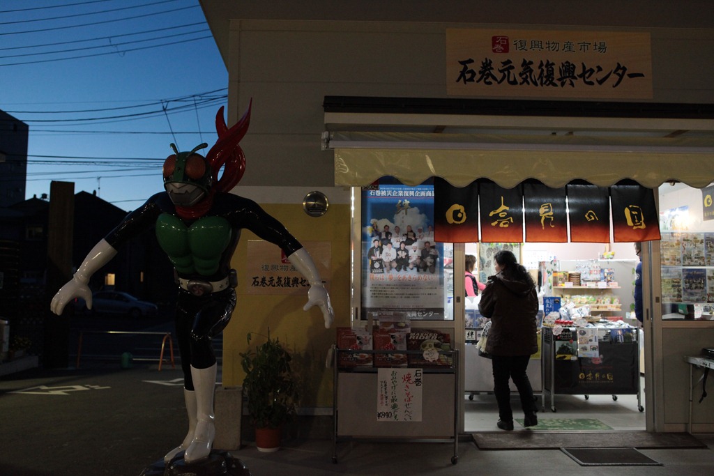 地方設置的「復興物產市場」,可以買到重建區的產品。屋外有地方漫畫家作品為大家加油。(攝影/馮小非)