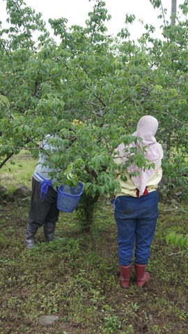 梅子的摘採分為兩種方式,手採以及竿採,竿採是指人站在梅樹上,以竿子敲打梅樹,下方有其他人用網子鋪在地面,再將打落的梅子集中收集,無論是手採以及竿採,全都採純人工進行,但收購的價格不一,一般而言,手採較高,目前手採梅一公斤15元,竿採梅則是一公斤10元。