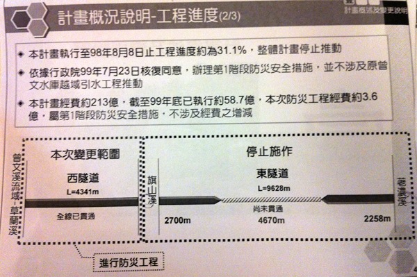 按水利署所提出的變更內容對照表中指出,在莫拉克風災前便已完工的越域引水工程「西隧道」部份,因僅完成初步支撐,尚未進行永久襯砌,卻因停工時間過長而有部分受損之現象,為防止災害發生,故有進行永久襯砌之必要。報告更指出,使用圓形襯砌可「一次完成全斷面之混凝土澆置」,除可縮短工期,降低災害發生,也有「較佳之結構性」。