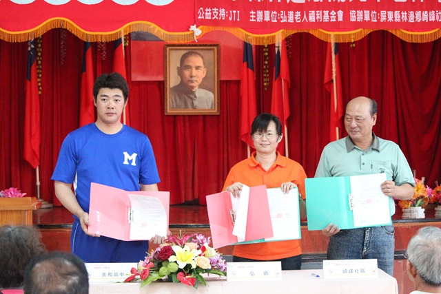 左起:教練趙仁豪、弘道高雄服務處主任林明好、崎峰社區發展協會理事長陳水村