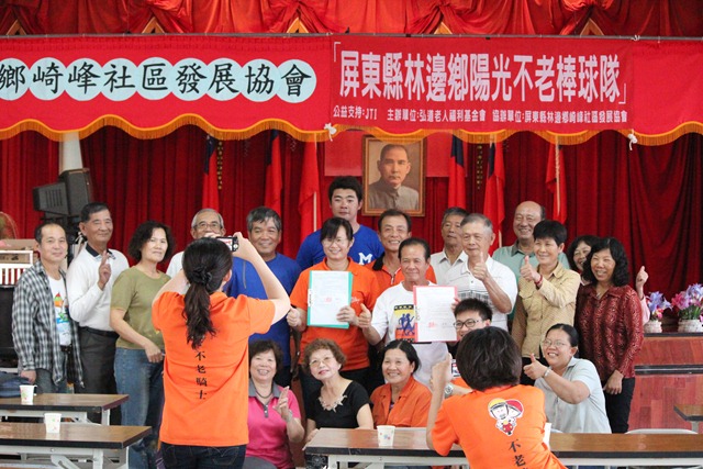 林邊地區居民在弘道老人福利基金會協助下成立了林邊陽光不老棒球隊,5日在崎峰社區活動中心舉行成立茶會,並在眾人的見證下,球隊、基金會以及教練三方舉行簽約儀式,這支球隊目前有12名成員,都來自於林邊地區年滿65歲的長輩,其中更不乏有夫妻檔、姐妹共同加入球隊。