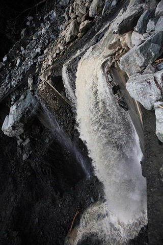 12.9K處有大量砂石堆積,路面甚至出現「激流」,走在此處宛如在溯溪一般,現場並有大量車輛被棄置在此