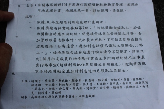 族人Alas拿出她前天收到的公文,這塊地上交叉地種了造林樹種以及五十幾棵的台東李,是父親手上就接受造林的,可是當時的公所承辦人員說,裡面有果樹沒有關係,只要是有造林就可以了,結果現在她被要求還給國家當初的造林金,以一甲18000元論,累積了四、五年,加計利息,遠遠超乎Alas可以負擔的範圍,不知如何是好。公文上牽涉的族人,從高中、桃源、勤和到梅山口都有)