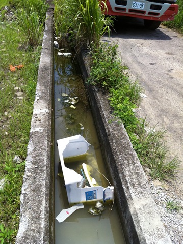 (左)對於二期稻作總是因為沒有水圳、馬達又停止抽水而被迫休耕的窘境,農民表示已經習慣了。(右)為了配合河川疏濬工程而遲遲無法修復的公田水圳,堆積了一些垃圾。