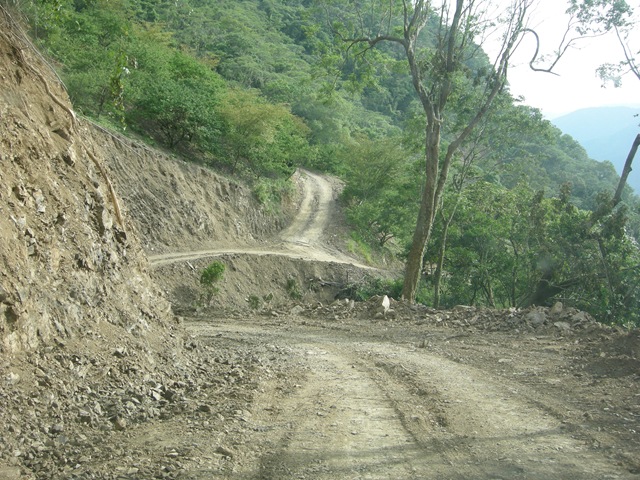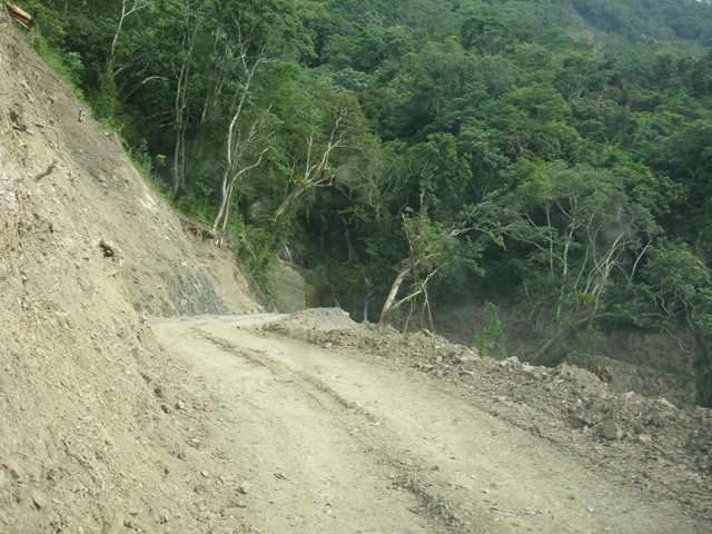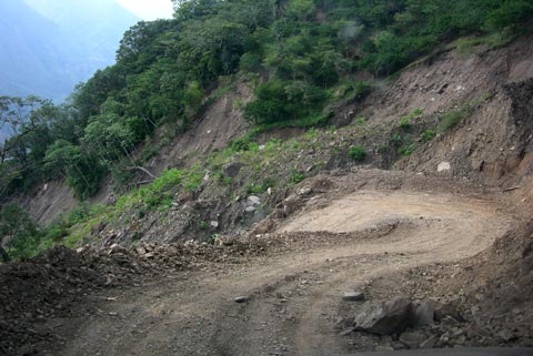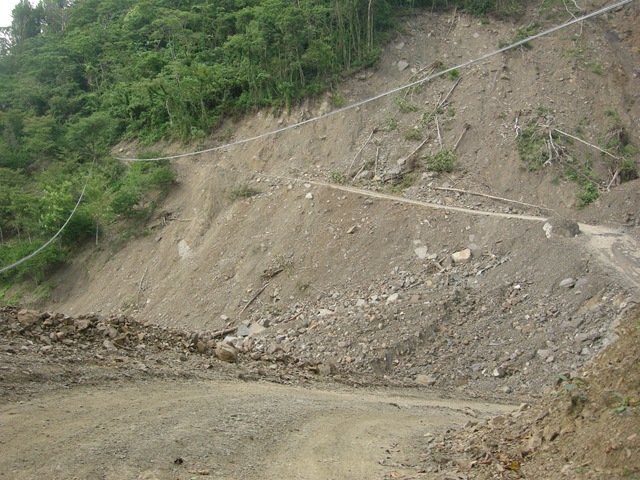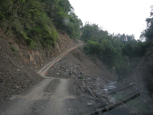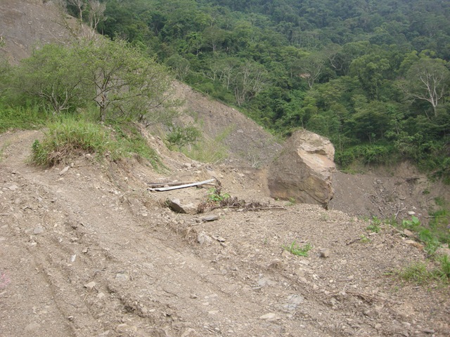 蜿蜒山壁的道路宛如凌空。 目前只有單線道、九成以上鬆軟容易崩落的邊坡,沒有任何防護措施。路面都是泥土和碎石,容易打滑,居民都要趁晴天沒有下雨時通行。