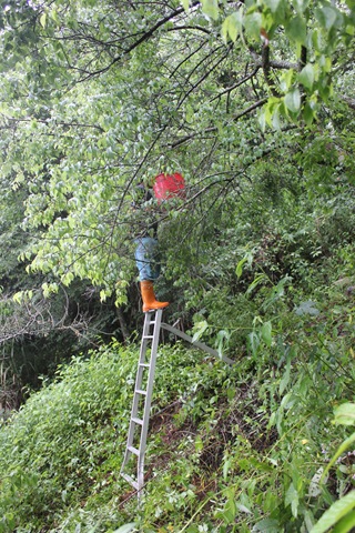 (左)沒有矮化的梅子樹,需要搭梯子手採(右)一支水桶加善攀爬的身手是手採梅工人惟一配備