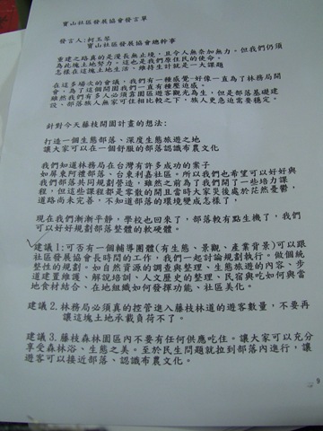 掌管藤枝國家森林遊樂區的屏東林管處,跟族人報告林道各項復建工程、新藤枝上方平台接駁停車空間規劃,以及結合寶山周邊產業發展規劃等項目,並且建議部落可以提供在地商品給園區代售、受邀表演、提案爭取參與林管處高屏區生態旅遊策略聯盟或者是提案申請社區林業計畫等方式參與。