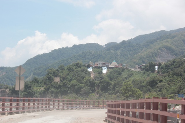 從樂農橋頭可以看到桃源里長老教會後方崩塌,自610災後就鋪上帆布減緩邊坡掉落(20120628檔案照)