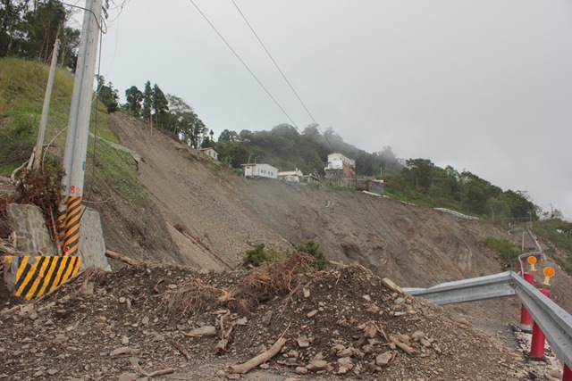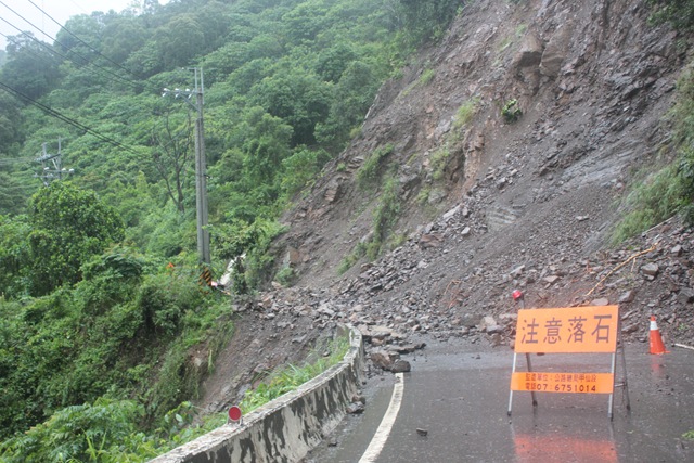 南橫公路便道84K處(寶來往高中,接進高中里轉角前)本為落石好發處,平時一場午後陣雨就會引起落石,隨時需要怪手或小山貓待命清路,遇到豪大雨更是崩塌嚴重,往往搶修不及(20120612檔案照)
